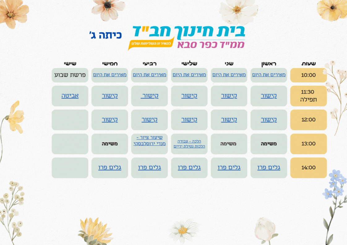 מידי יום אי"ה בתקופה הקרובה ניפגש כאן לתפילה בשעה 11:30, ולשיעור חווייתי, בכל יום בנושא אחר.
